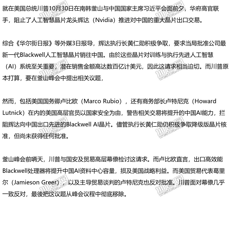 而川普結束亞洲行後,在「60分鐘」(60 Minutes)專訪中說,美國會允許中國與輝達做生意,但不包括最先進晶片。他談及Blackwell處理器時說:「我們不會把那晶片給別人。」不過,他並未明確說,是指效能最佳版,還是輝達正在設計的降級版。