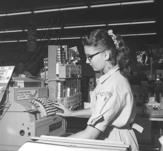 她身穿整洁的制服,戴着眼镜,在一台机械收银机前工作,体现了美国超市的秩序和效率。
