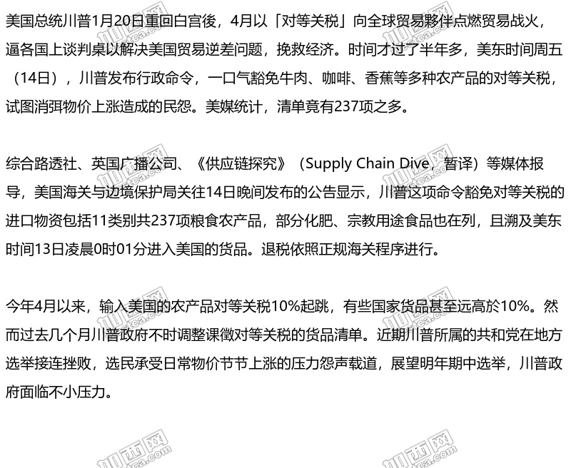 川普扛不住民怨 多达237项进口农产品免对等关税