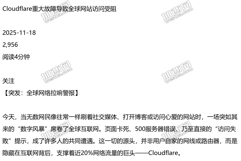 就在刚刚,全球领先的网络服务及安全公司Cloudflare遭遇了一场严重的全球级别技术故障。其官方状态页面一度亮起红黄相间的警报,确认其网络正在经历“广泛的服务中断”。这一故障如同在互联网的“交通枢纽”投下了一枚巨石,涟漪效应迅速扩散至全球各个角落。