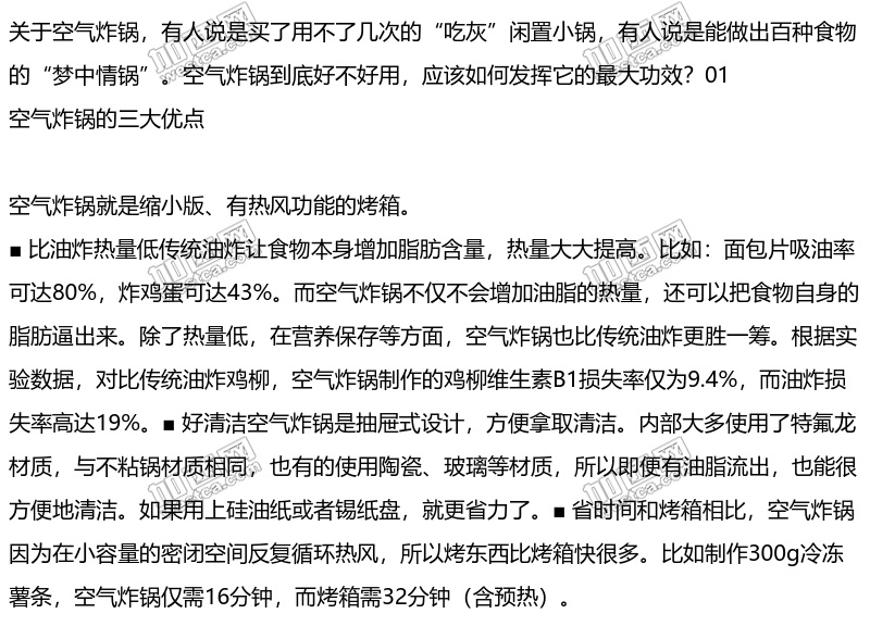 看到这里是不是跃跃欲试了?别急,使用空气炸锅时要注意以下几点。■ 配备这些,更省力懒人必备——锡纸盘、硅油纸盘:使用锡纸盘或硅油纸盘可以防止食物粘在空气炸锅的烤篮上,方便清洁,也能更好地控制油脂摄入。省油必备——喷油壶:喷油壶可以帮助将少量的油均匀地喷洒在食材表面,保持食物的口感。■ 使用小贴士使用空气炸锅时记住这几点,就可以在享受美食的同时,控制有害风险。少烤淀粉类食物——空气炸锅更适合有点油脂和水分的食物,比如肉类。淀粉含量高的食物容易烤焦,产生有害物质。控制好温度和时间——每个空气炸锅有它自己的“脾气”,在使用时多摸索。推荐可视化炸锅,可以看到食物变化。食物表面只要变金黄了就可以了,不要过度烘烤成褐色。不要把空气炸锅当成做饭的主力——空气炸锅温度高,没必要经常用空气炸锅高温烹饪食物。平时可以多使用蒸、煮、炖、凉拌等相对低温的烹调方式。
