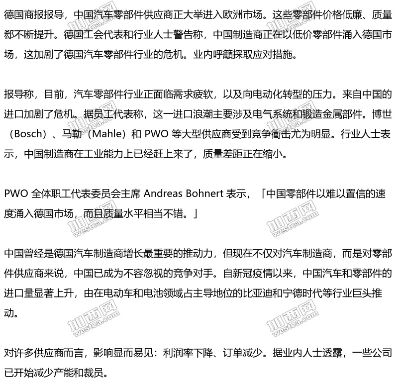 在马勒(Mahle),员工代表也对新的竞争压力发出警告:总工会主席 Boris Schwürz 表示,有些中国报价「明显低於制造成本」。中国竞争对手正在进入长期被视为德国拥有优势的产品领域。甚至福斯(Volkswagen)、宝马(BMW)和宾士(Mercedes-Benz)等德国汽车制造商也越来越多地採用中国零部件。