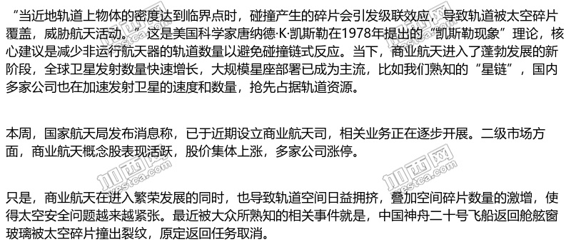 在国家航天局发布的最新文件中,也谈及了“空间碎片监测预警与减缓清除”的相关问题。太空没有红绿灯,客观地说,太空已成为关乎国家发展与经济安全的新疆域,用卫星“保护”卫星,发展自主可控的太空感知能力,保障在轨资产安全,已成为商业航天的新战场。