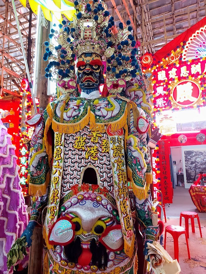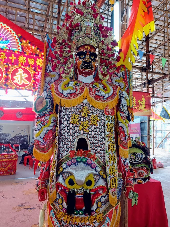 祂身穿精緻的纸紮神衣,脸呈怒相,头戴装饰华丽的宝冠。