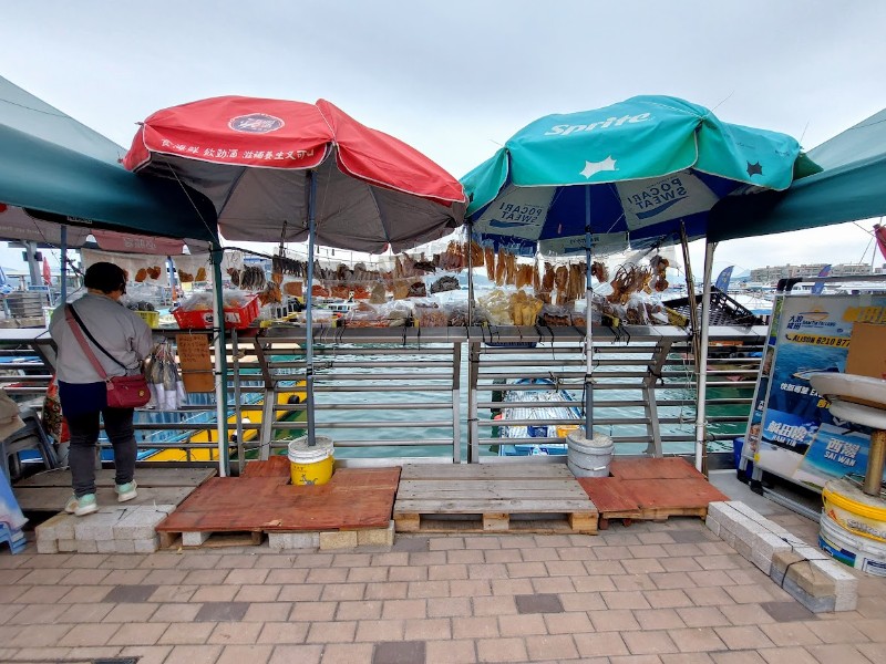 摊位上挂满了各式各样的海味乾货(如鱼乾、鱿鱼乾等)