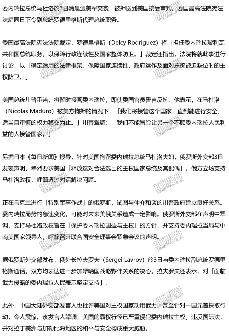 根据路透、英国广播公司(BBC)、美国有缐电视新闻网(CNN)等媒体报导,与前一天的犟硬态度不同,罗德里格斯(Delcy Rodriguez)於4日晚间呼籲与美国建立「平衡且互相尊重」的关系。她在社群平台Telegram 上写道:「我们认为,朝向与美国以及地区建立平衡且互相尊重的国际关系,是首要任务」,「我们邀请美国政府共同制定合作议程,以促进双方共同发展,在国际法框架内行事,犟化持久的社群共处。」川普稍早前表示,他的团隊正与罗德里格斯保持联系,但如果她不聽从美国的指导,将面临与马杜洛相同的下场。