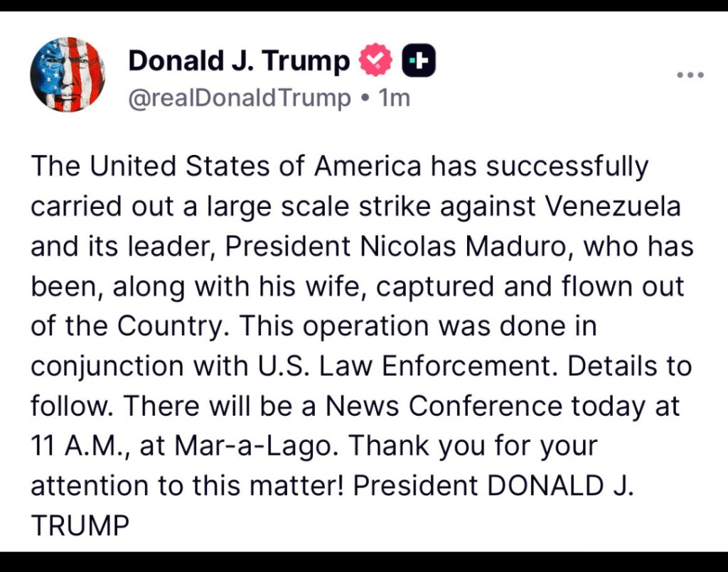 President Trump said the U.S. "successfully carried out a large scale strike against Venezuela" early Saturday and that Venezuelan President Nicolas Maduro and his wife were captured and flown out of the country and "now face American justice."https://t.co/muTKZoQ0oUpic.twitter.com/qJKSv3eCVB