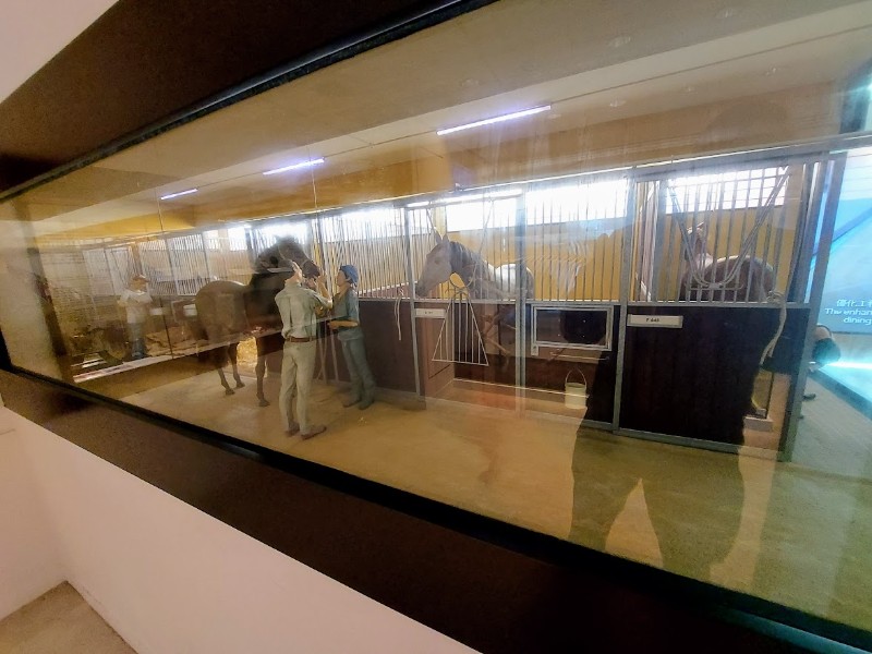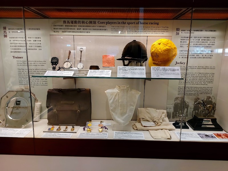 展示了多种历史文物,例如马鞭、怀錶、头盔(包括一个黑色的和一个黄色的)、练马师和骑师的制服(包括白色衬衫和长裤)以及马鞍等。