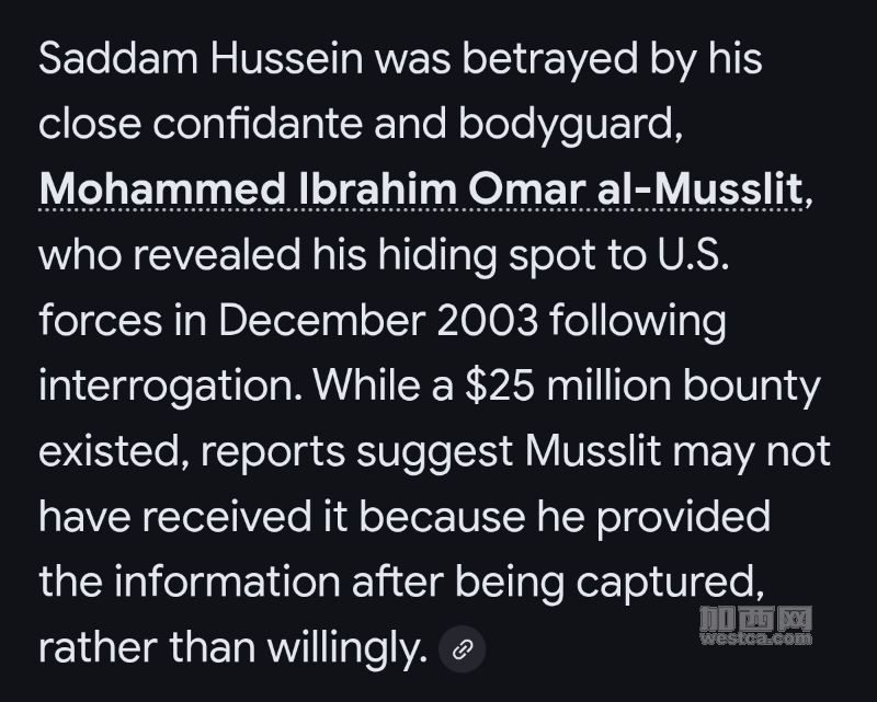 还有就是萨达姆。。。同样被悬赏,被叛徒(贴身护卫)出卖被抓,最後被送上绞刑架,那2500万美元赏金叛徒也是一个子儿没拿到。