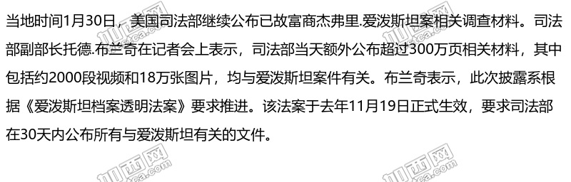 美國司法部繼續公布300萬頁已故富商傑弗裡.愛潑斯坦案相關調查材料