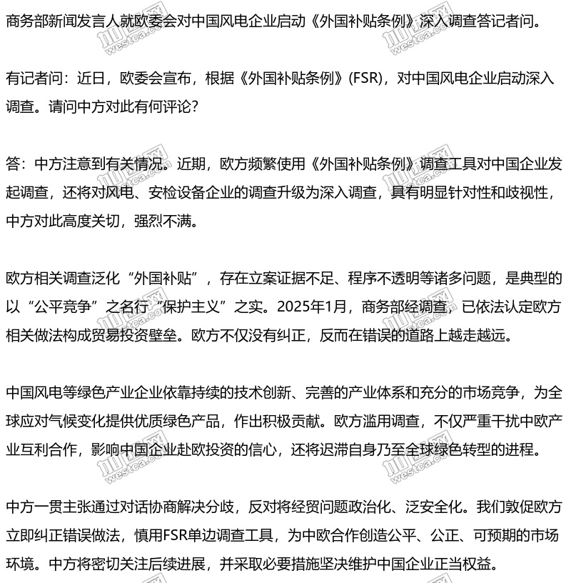 欧委会对中国风电企业启动《外国补贴条例》深入调查