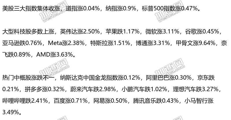 美股三大指数集体收涨
