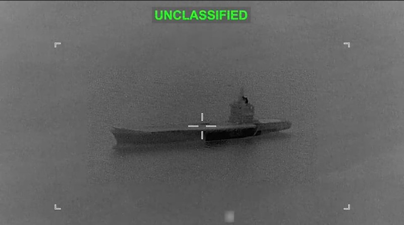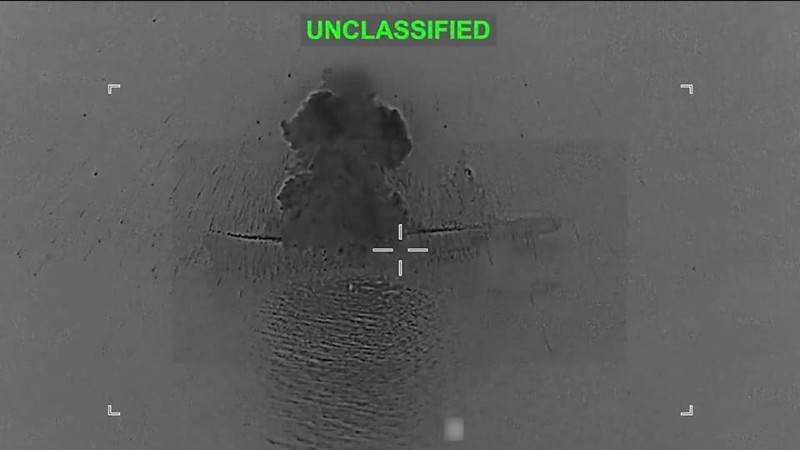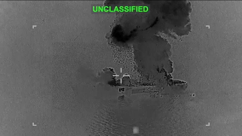 美國中央司令部發布伊朗海軍改裝自民間貨船的無人機母艦被攻擊起火的影像。