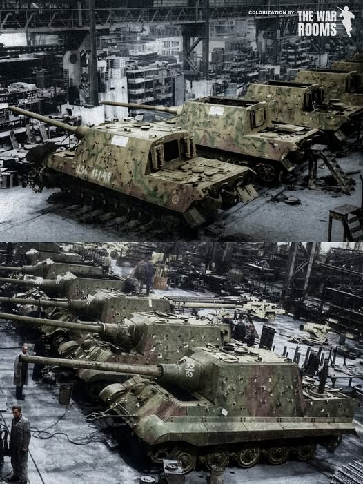 Jagdtiger獵虎坦克殲擊車,它們整齊地排列在裝配車間內。