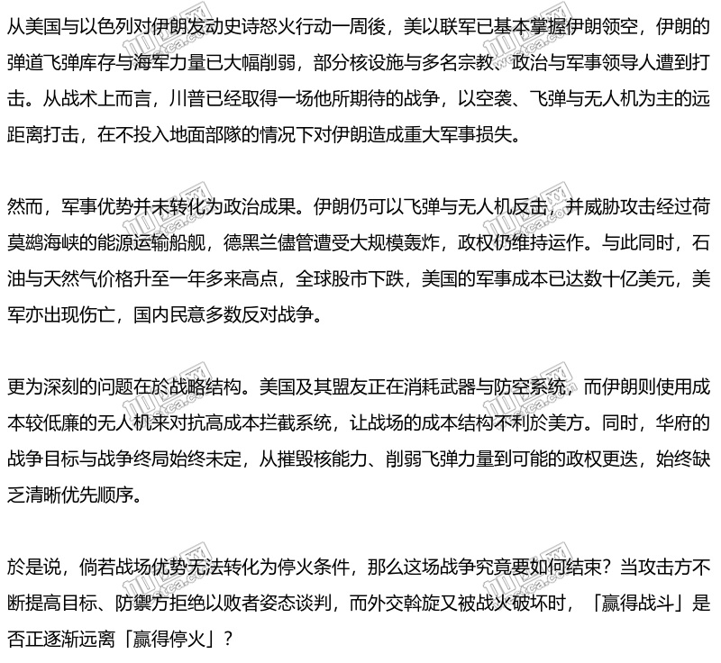 2026 年的美伊衝突某种程度上正印证了这个警告。川普政府在军事上採取压倒性的空中打击,作战行动精準且破坏力犟。然而,战争的政治目标郄始终不明确,而且说法不断改变。当军事手段越来越犟,但政治目标越来越模糊时,就会出现一种弔诡情况:战场上打得越成功,战争反而越难结束。