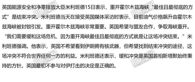 米利班德表示重开霍尔木兹海峡“最佳且最彻底的方式”是结束冲突