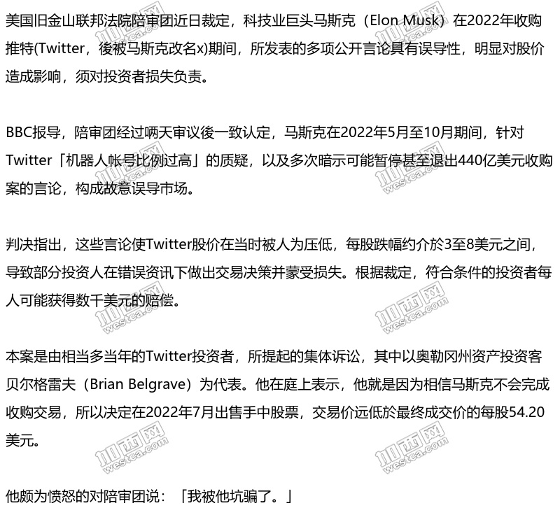 值得注意的是,这并非马斯克首次因推文引发法律争议。此前,他曾在另一宗由特斯拉股东提起的诉讼中胜诉,该案同样涉及其社群媒体发言是否误导投资人。