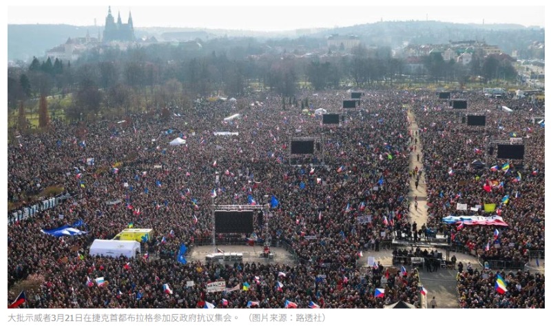 綜合媒體報道,3月21日,超過20萬名捷克民眾在首都布拉格游行示威。這次抗議活動由“民主百萬時刻”(Million Moments for Democracy)發起,口號為“我們不會讓未來被偷走”。