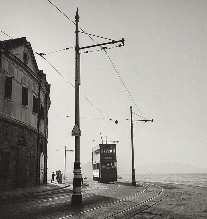 捕捉了历史悠久的香港叮叮车行驶在港岛北岸海滨的场景。