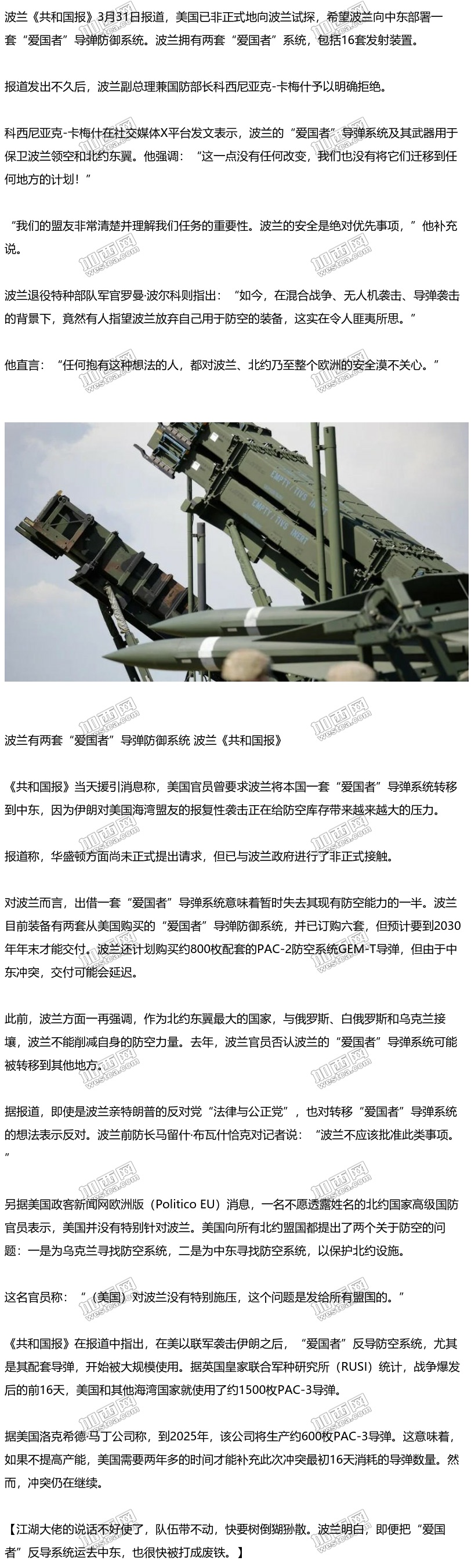 波兰拒绝美国把自己的爱国者导弹系统移至中东
