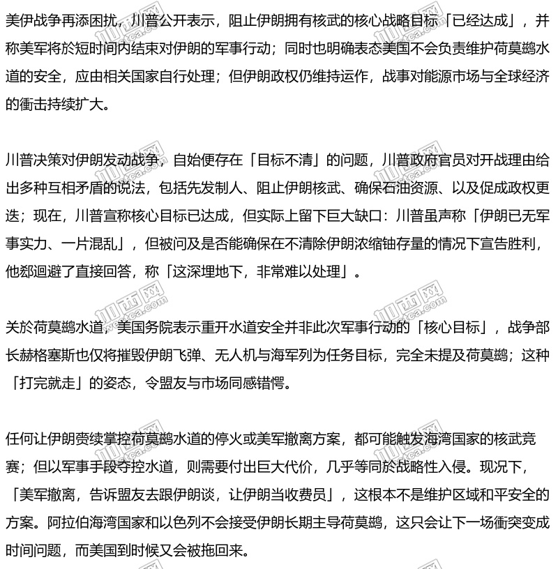 川普此次决策的核心矛盾在於:以「战术胜利」替代「战略完成」,以「宣告离场」代替「确保秩序」。荷莫鹚水道的问题未解、伊朗政权仍存、浓缩铀去向未明,三大悬念叠加,使所谓的「胜利」更像是一次有代价的搁置。
