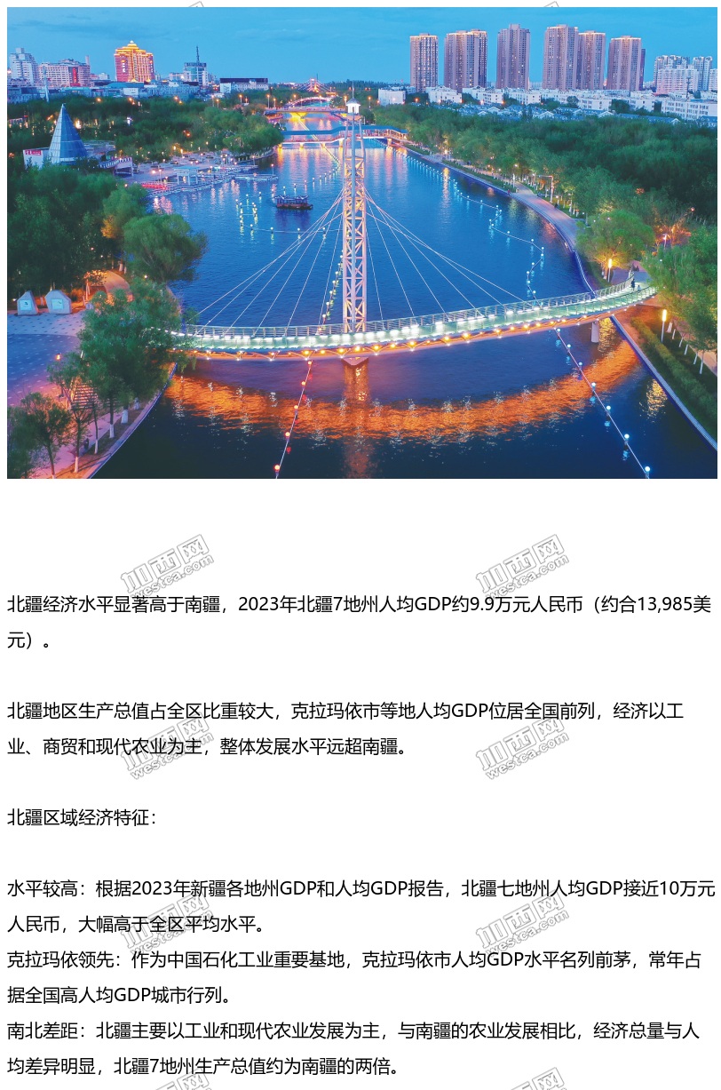 新疆北部經濟水平顯著高於南疆:經濟以工業、商貿和現代農業為主,整體發展水平遠超南疆。