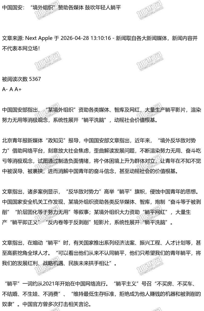 國安:“境外組織”贊助各媒體 鼓吹年輕人躺平