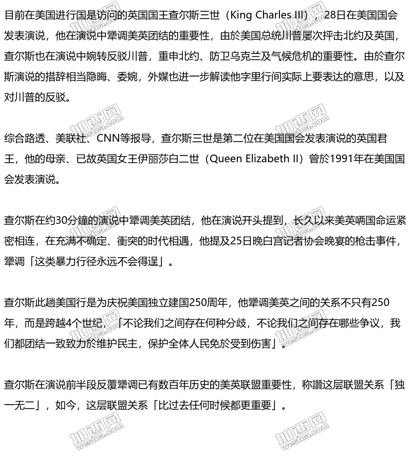 他在後續演說中,婉轉、堅定地反駁過去數月來川普對英國、北約的多項指責。今年稍早,川普貶低北約在阿富汗戰爭中的貢獻,宣稱北約從前缐「退縮」,查爾斯強調,911恐攻後,美國成為第一個援引北約共同防禦條款的國家,「我們共同響應了這一號召,正如過去一個世紀以來我們的人民所做的一樣,肩並肩挺過唡次世界大戰、冷戰、阿富汗戰爭,以及那些定義我們共同安全的重要時刻」,他接著巧妙地呼籲美國繼續保衛烏克蘭,「今天,捍衛烏克蘭及其最勇敢的人民需要同樣的堅定決心,為了確保真正的公正及持久的和平,我們也需要這種決心」。