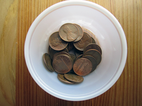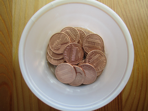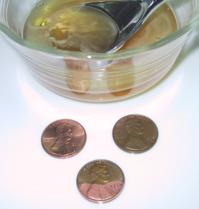 1. 將要清洗的1cent硬幣放入一個容器中, 放些鹽,然後倒入白醋沒過硬幣. 2,3分鍾就可以看到舊硬幣開始變黃銅色, 其間可以翻動下硬幣~~