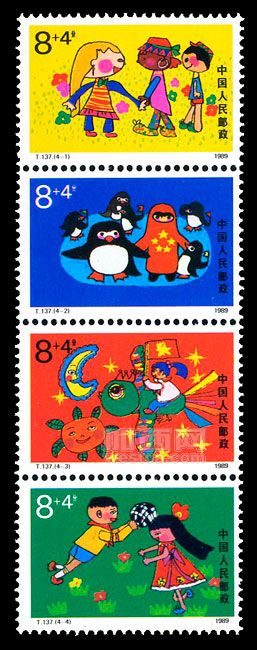 1989年6月1日,原邮电部发行第二套儿童附捐邮票T137《儿童生活》特种邮票4枚,每枚面值各为8分邮资+4分附捐金额。