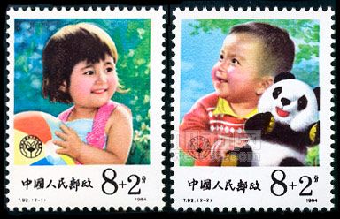 新中国第一套附捐邮票T92《儿童》特种邮票2枚(1984年2月16日发行),全套邮票售出后集资60万元,通过中国少年儿童基金会支援儿童福利事业。