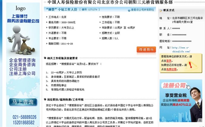4、中國人壽取得了這1000個店的“獨家合作”,在所有店裡派了自己的保險推銷員,相當於人壽在北京1000小區開了營業部。看看下面這個人壽為博愛小站招聘“站員”的網頁, “博愛小站”的工作人員,要求有保險經紀資格,這充分說明“博愛小站”的本質是保險公司的銷售網點。商業利益昭然若揭。