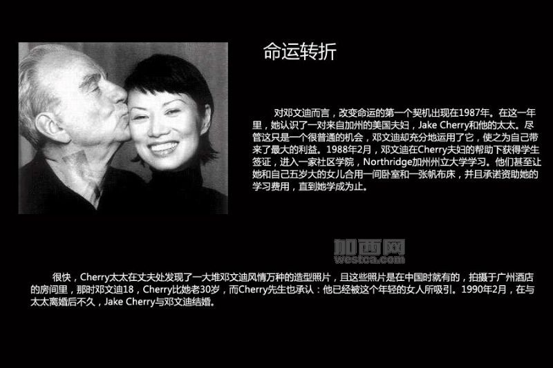 邓文迪命运里的第一个契机出现在1987年。她认识了一对来自加州的美国夫妇,JakeCherry和他的太太。Cherry先生当时50岁。Cherry太太闲暇无事,很乐意帮助邓提高英语水平。尽管这只是一个很普通的机会,邓文迪却抓住了它并充分地运用了它。