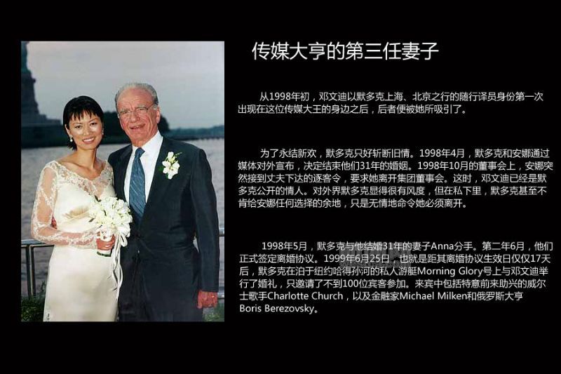 1999年6月25日,也就是距其离婚协议生效日仅仅17天后,默多克在泊于纽约港的私人游艇MorningGlory号上与邓文迪举行了婚礼。
