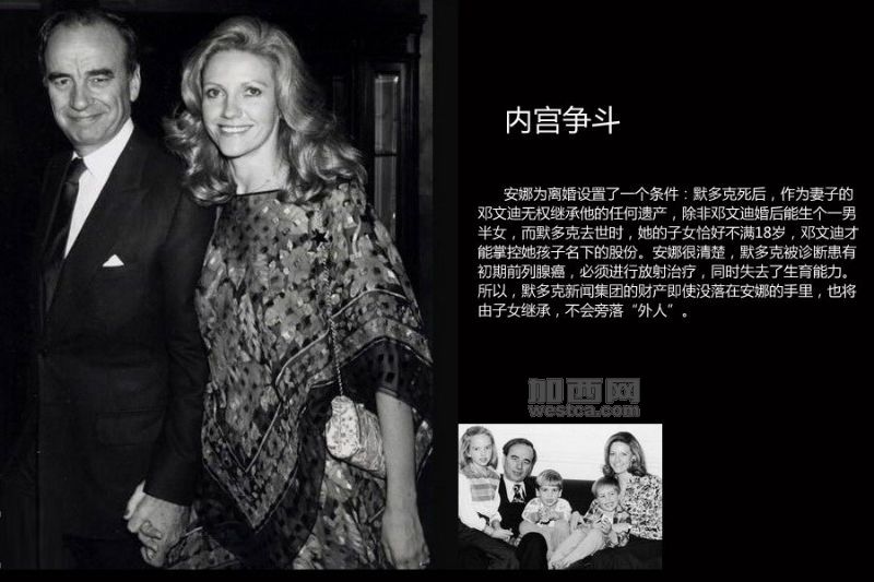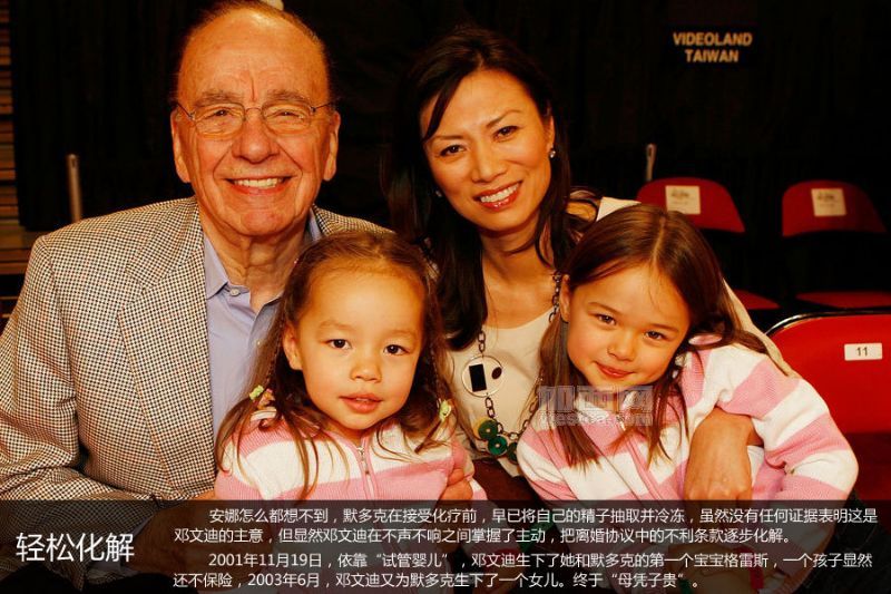 默多克550亿财产如何分配成焦点。在他第二次婚后不久,默多克便被查出前列腺癌,不得不接受放化疗,而这意味着他将从此失去生育能力。根据他和第二任妻子安娜的离婚协议,默多克死后,作为其第三任妻子的邓文迪无权继承他的任何遗产,除非她在婚后能生个一男半女。机关算尽的安娜做梦也没有想到,邓文迪居然利用默多克手术前的冷冻精子,先后于2001年和2003年生下了两个“试管女儿——格雷丝和克洛伊。