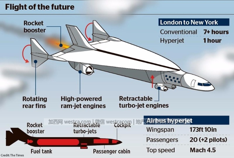 外媒报道说,这种被称作火箭似的飞机, 飞行速度可以达到4.5马赫(Mach)( 一马赫表示音速的一倍。4.5马赫即是音速的4.5倍)。 翻译过来意思就是飞行速度可达每小时5500公里。