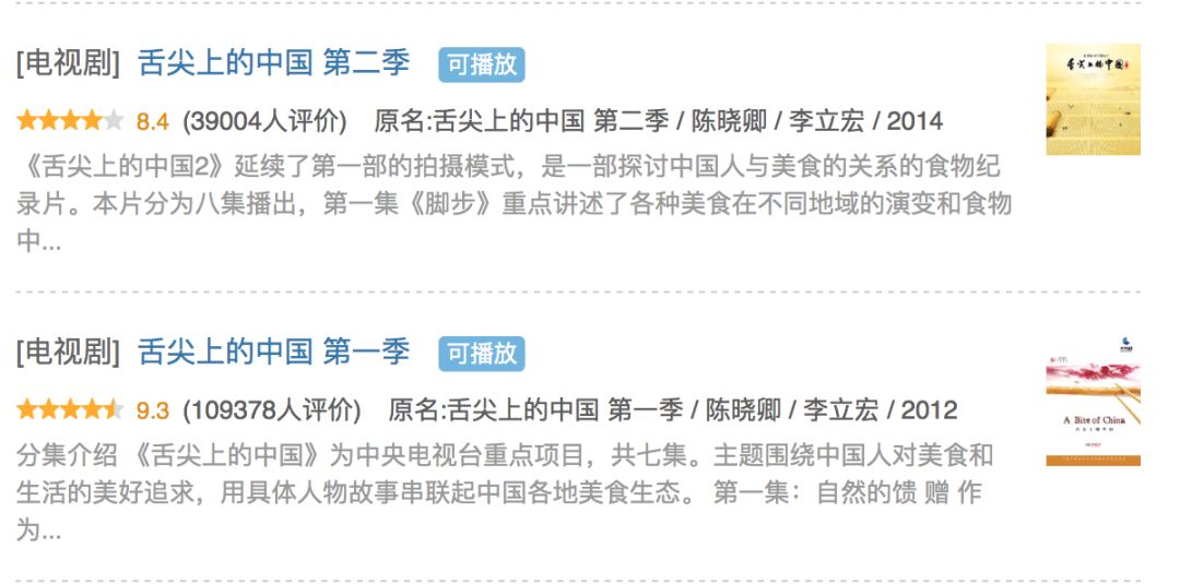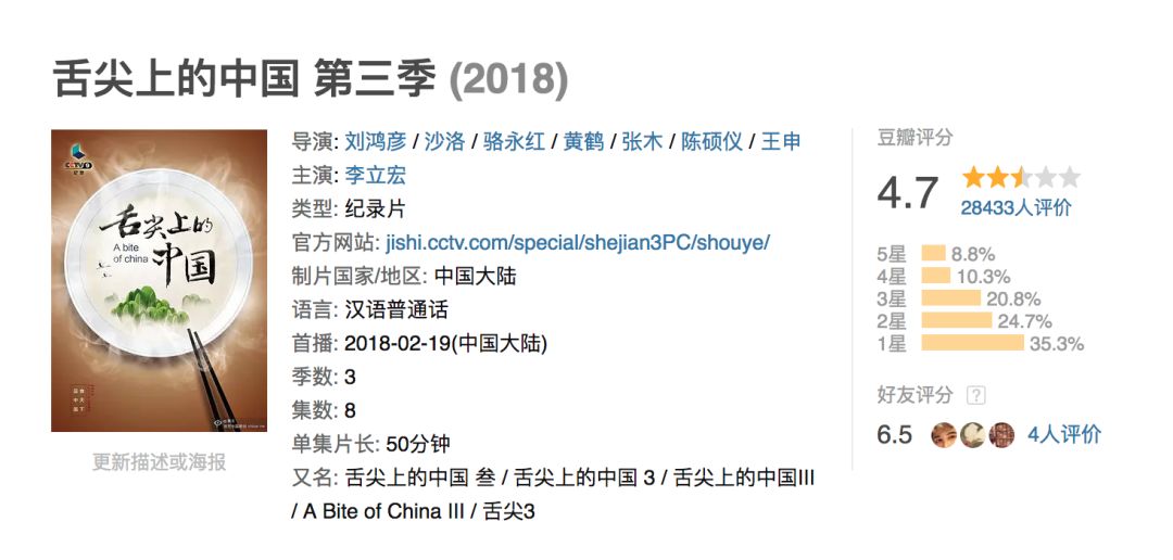 要知道第一季舌尖上的中國豆瓣評分可是9.3啊,第二季就算評分略有下滑,但也在8.4分的水准。