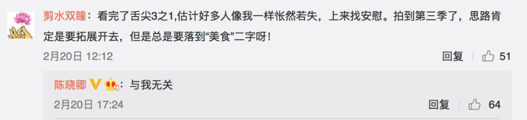 這季舌尖還沒播出完畢,廣大網友已經明顯對這個國民IP失去了信心,很多網友也跑到第一二季導演陳曉卿微博下留言訴苦,可陳曉卿早已離開
