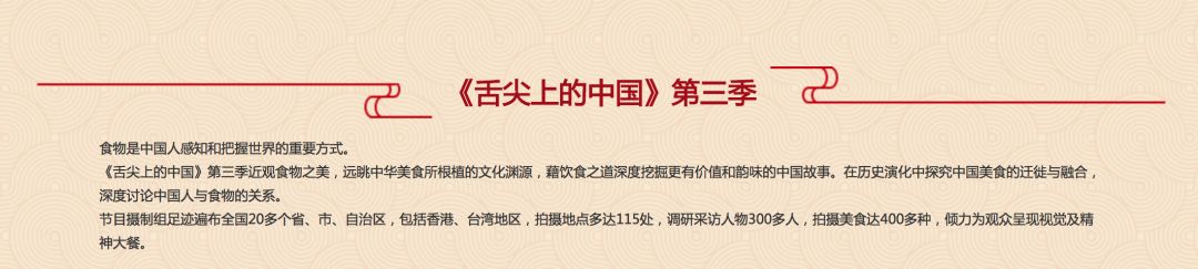 關於第三季的主題,舌尖上的中國官網已經寫的很清楚——近觀食物之美,遠眺中華美食所根植的文化淵源,藉飲食之道深度挖掘更有價值和韻味的中國故事。在歷史演化中探究中國美食的遷徙與融合,深度討論中國人與食物的關系。