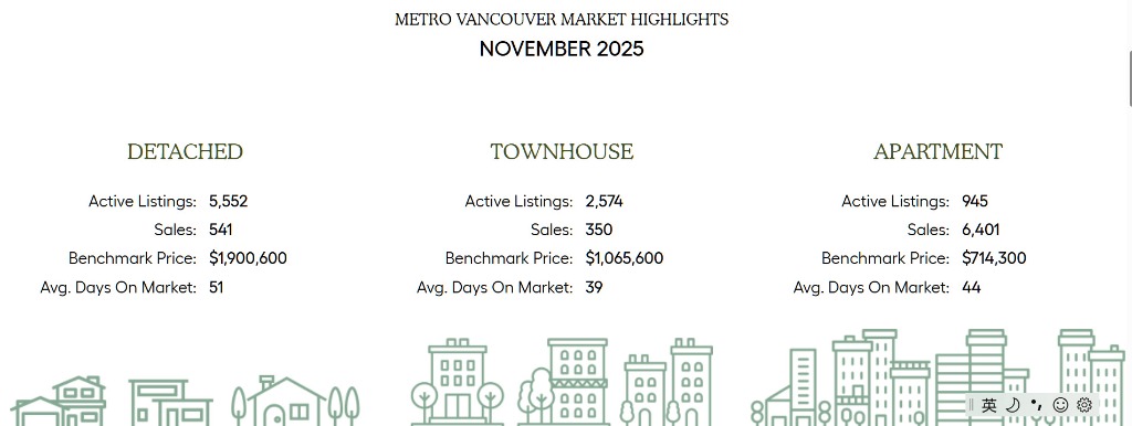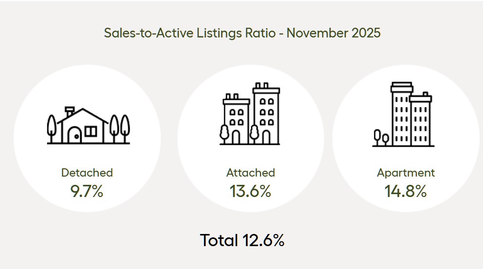 2025年11月,所有獨立式住宅、聯排住宅和公寓的銷售與活躍掛牌房源比率為12.6%。按房產類型劃分,獨立式住宅的比率為9.7%,聯排住宅為13.6%,公寓為14.8%。