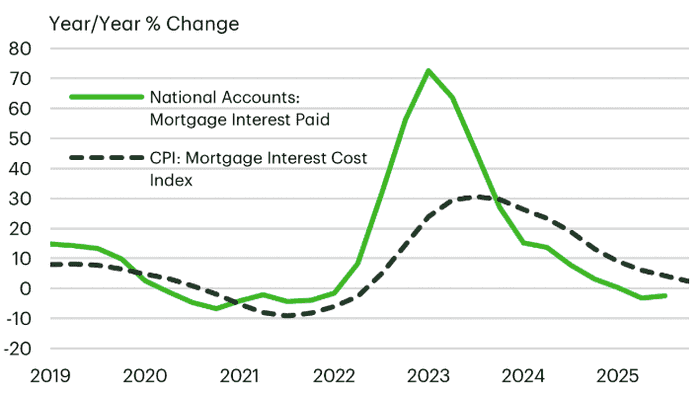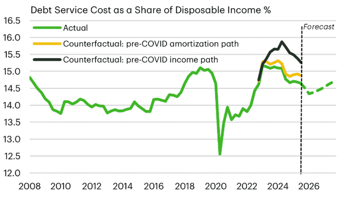 加拿大央行 2025 年 7 月的单独估计表明,到 2026 年底续签贷款的加拿大抵押贷款持有人中,约有 60% 将面临更高的还款额,预计 2025 年家庭还款额将比 2024 年 12 月高出 5%,2026 年将高出 6%。