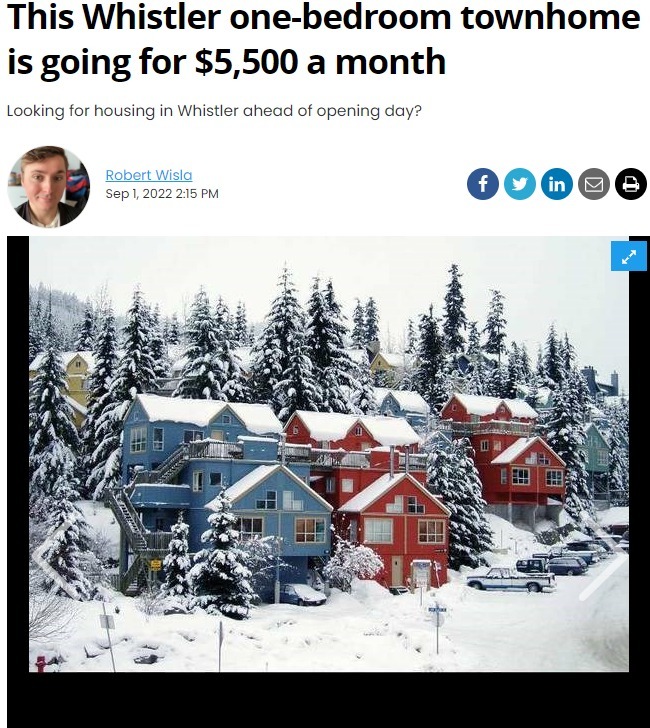 这套位于惠斯勒的一居室联排屋开始招租,针对今年冬季的旺季租金价格为 5500 元/月,是温哥华一居室租金中位数的两倍还要多!