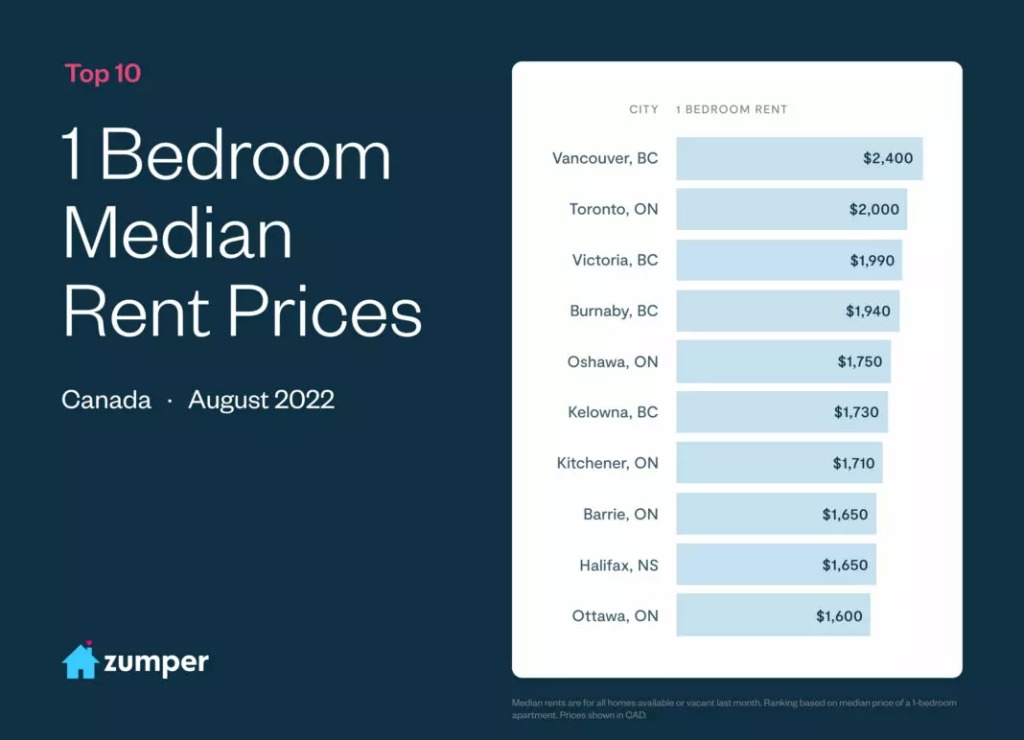 (加西网综合)根据加拿大租赁网站 Zumper 的数据,8 月加拿大一居室中位数中最贵的城市是温哥华,一居室月租金 2400 元,其次是多伦多 2000 元。