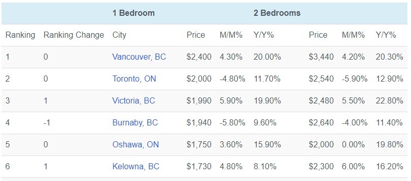 根据该网站的数据,在租金最贵的城市温哥华,两居室月租金则需要 3440 元,这已经遥遥领先全国其他城市,比多伦多、本拿比、维多利亚等地的两居室要贵近 1000 加元。
