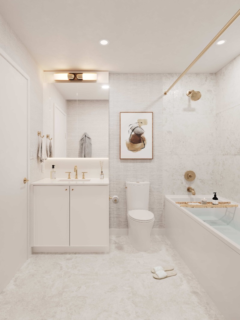 宽大的窗户让室内自然采光充足,房屋的每个元素都经过精心设计。精美的浴室配备定制盥洗台、宽敞的抽屉,可最大程度地提升储物空间,浴缸和淋浴间均配备手持花洒,所有套间均配备雨淋式花洒。房屋提供三种自然风格的配色方案,均铺设宽板拉丝橡木复合硬木地板。