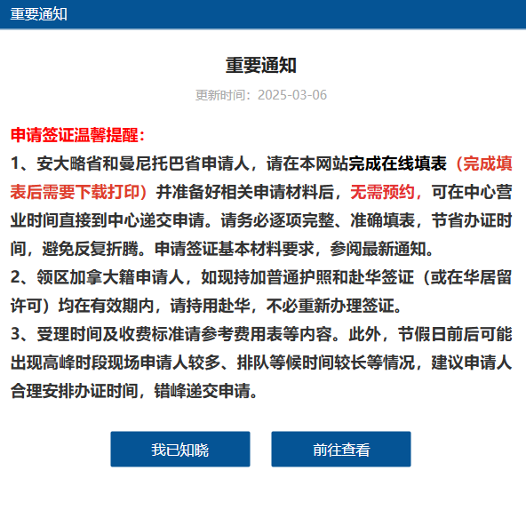 1、渥太华中国签证申请服务中心将于2025年9月30日启用中国签证在线审核平台。届时申请人须登录中国签证申请服务中心网站www.visaforchina.cn 选择“Canada, Ottawa”,在线填写《签证申请表》并上传签证材料,待网上审核通过后,再前往签证中心递交材料。具体通知请点击这里查看。