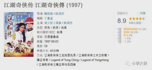 话说此剧是在当时台湾被称之为“神剧”的《江湖奇侠传》,一部九十年代末播出的清装戏。唉,我那时候只顾看小燕子啦,太肤浅了。。。这部戏在大陆不太红,也许是精灵古怪天真烂漫的小燕子太闪亮了,同时期的其它剧都黯然失色。但是有时候,一部好的影视作品不是用红不红来衡量的。