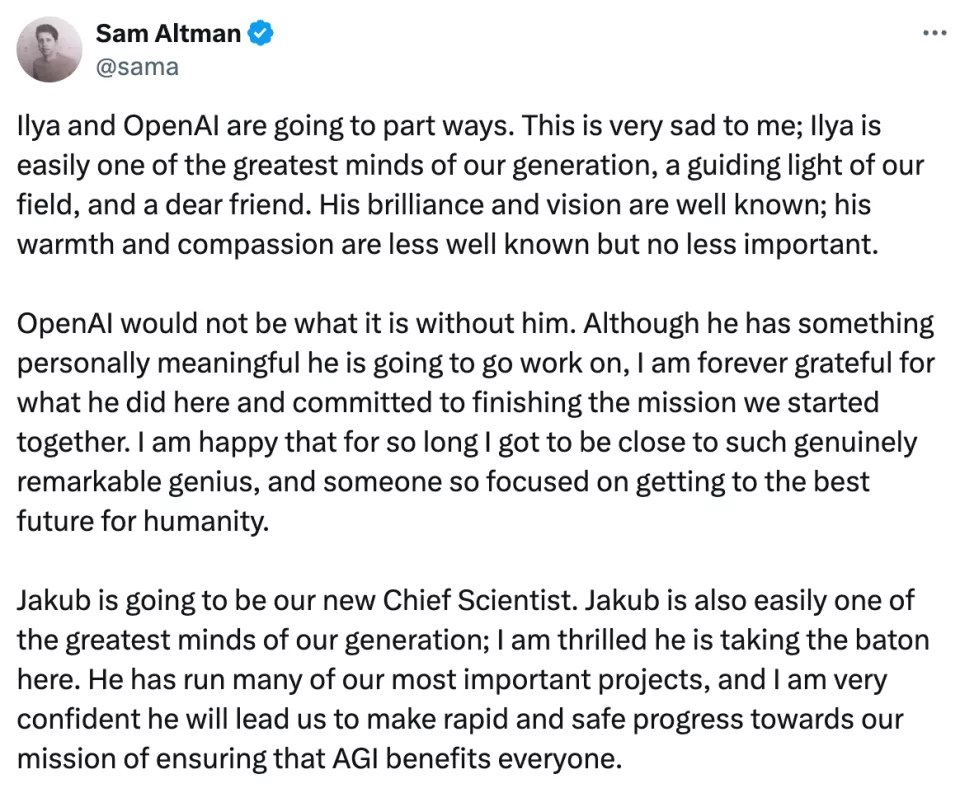 与此同时,OpenAI总裁格雷格·布罗克曼(Greg Brockman)也在X上发帖,回顾了与苏茨凯弗共同创业的时光,并对其所作贡献给予感谢。