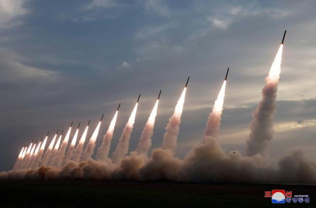 韩国联合参谋本部(韩联参)表示,侦测到朝鲜当天清晨6时14分左右从平壤顺安一带向韩半岛东部海域发射十几枚疑似短程弹道导弹(SRBM)的飞行物。(KCNA)