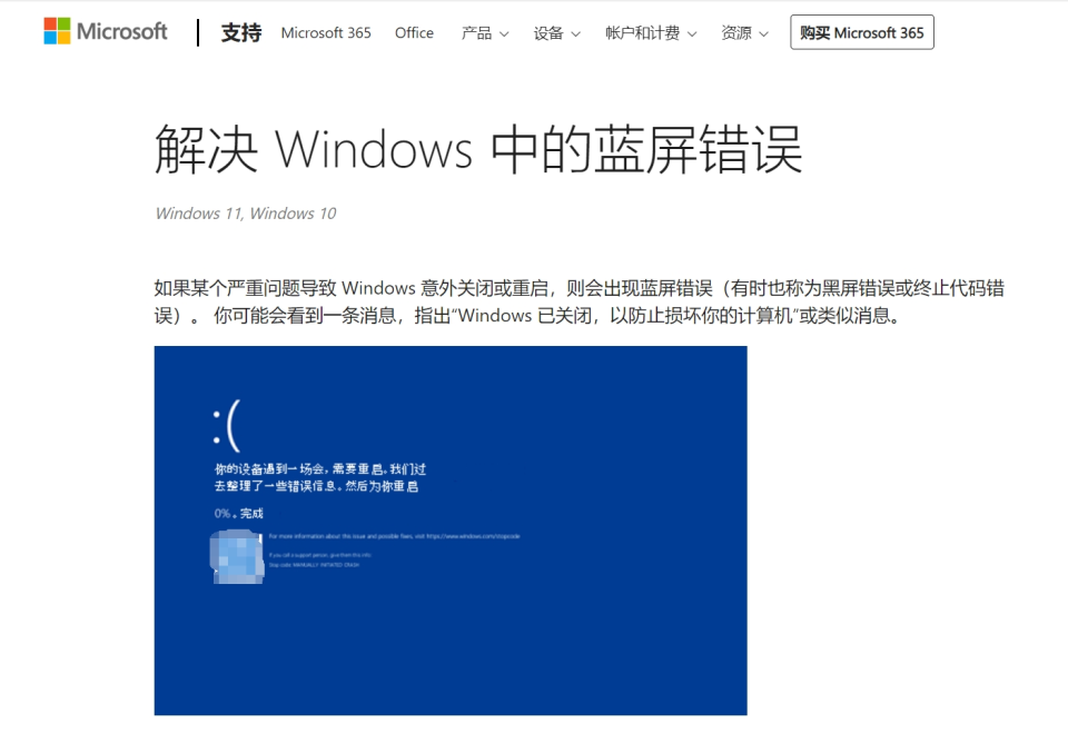 微软官网关于“解决 Windows 中的蓝屏错误”的说明显示,如果某个严重问题导致 Windows 意外关闭或重启,则会出现蓝屏错误(有时也称为黑屏错误或终止代码错误)。 你可能会看到一条消息,指出“Windows 已关闭,以防止损坏你的计算机”或类似消息。
